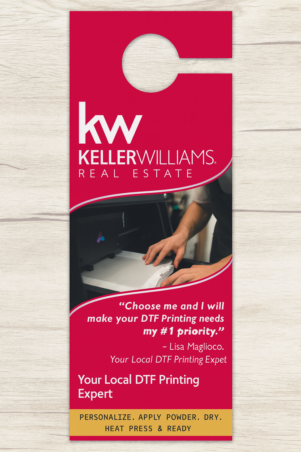 Die-cut hangers that hook over door knobs, with options for size, perforated tear-off section, and paper type.